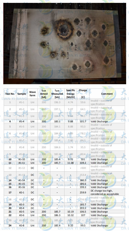 本次測試標準IEC61400-24,能量10MJ,電流20萬安培,測試制板完全模擬國內(nèi)風(fēng)電主流使用的鋪貼工藝和層間結(jié)構(gòu)。令人欣喜的是,進行實驗的317gsm鋁網(wǎng)和420gsm銅網(wǎng)在經(jīng)歷三次短波、三次長波沖擊后,都有效的保護了層間結(jié)構(gòu),并在傳導(dǎo)區(qū)域沒有出現(xiàn)任何熔斷或斷裂,達到了一級防雷的效果。實驗報告結(jié)果附下。
