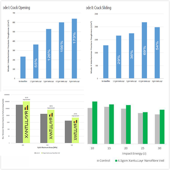 Xantu.Layr?納米纖維增韌膜采用靜電紡絲工藝,由幾千米長(zhǎng)的熱塑性聚合物納米纖維組成,每根纖維比發(fā)絲細(xì)500倍左右。特別適合用于環(huán)氧樹(shù)脂基碳纖維預(yù)浸料的層間增韌,提高了復(fù)合材料的斷裂韌性(抗脫層性)、沖擊后抗壓強(qiáng)度(損傷容限)和抗疲勞性能,使樹(shù)脂在受到壓力或沖擊時(shí)不易發(fā)生微裂紋。