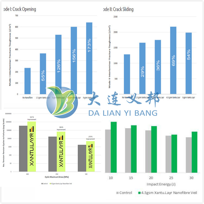 多種結(jié)果證明,使用不同規(guī)格的納米纖維增韌膜對復(fù)合材料層合板的斷裂韌性有不同程度的提升,其中4.5gsm Xantu. Layr可以提升156%。復(fù)合材料的斷裂韌性可提高69%,疲勞壽命提高394%。