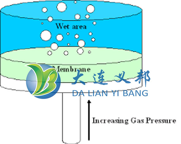 起泡點法測試原理:當(dāng)微孔濾膜和折疊濾芯用一定的溶液完全浸潤,然后通過氣源在一側(cè)加壓(實驗儀器里面有進氣控制系統(tǒng),可以穩(wěn)定壓力,調(diào)節(jié)進氣),隨著壓力的增加,氣體從微孔濾膜的一側(cè)放出,表現(xiàn)為膜一側(cè)出現(xiàn)大小、數(shù)量不等的氣泡,通過儀器判斷出對應(yīng)的壓力,判斷依據(jù)就是泡點。
