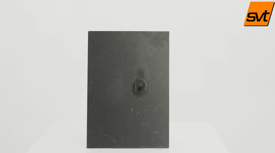 我們對已成型的防火織物復(fù)合材料板進(jìn)行了高溫粒子轟擊測試,測試溫度達(dá)到了1400度。我們采用環(huán)氧樹脂體系制作了電池包外殼,這種材料比傳統(tǒng)的鋁基材料輕了40%,但其堅(jiān)韌程度最高可提升5倍。此外,該材料具有出色的防火性能,并且能夠耐受高溫火焰沖擊,測試中接近1400℃的高溫火焰沖擊下,23秒內(nèi)沒有發(fā)生任何變形或穿燒現(xiàn)象。相比之下,鋁材質(zhì)在相同的溫度和距離下只需要6秒即被燒穿。