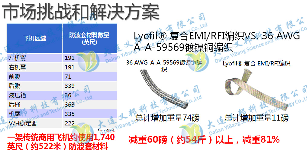 大連義邦引進(jìn)美國Syscom生產(chǎn)的金屬化高分子纖維絲Lyofil?(鍍鎳PBO纖維)作為編織主材,Lyofil?對比傳統(tǒng)鍍銀銅絲減重約73.2%,斷裂負(fù)載約是傳統(tǒng)鍍銀銅絲的11倍。源頭引入基材國產(chǎn)化先..